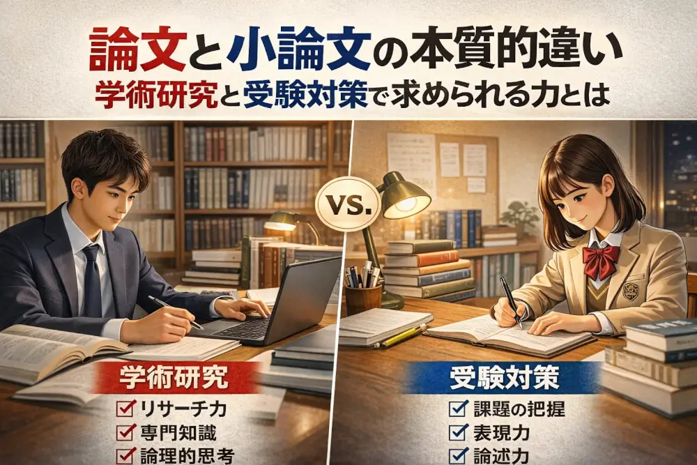 本記事では、論文と小論文が持つそれぞれの特性、執筆目的、評価基準の違いについて、実践的な視点から深く掘り下げていきます。これを理解することで、大学入試における小論文対策はもちろん、将来的な学術論文執筆への準備にも役立つはずです。